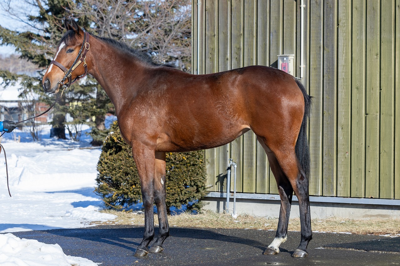 順調にトレーニングを積み重ねていて、現在は17-18のペースでの坂路調教、周回ダートコースにおける1000mの速歩と3400mのキャンターといったメニューに取り組んでいます。母系特有のスピード能力の高さに加え、柔軟性に優れている点がセールスポイント。四肢が長めで、将来的には、よりストライドが伸びる走りへと変化してきそうです。気性は強めですが、扱いにくさはありません。 -